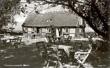 Syv søstre satser I slutningen af trediverne blev tiderne bistre. Alexander overvejede at sælge sit elskede hus ved Skäret. Det siges, at kriser afføder nye idéer, og når de ældste døtre hørte om salgsplanerne, fik de en lys sådan: ”Vi starter en kaffestue og taget betalt for kaffen”. Som sagt så gjort. Den 1. maj 1938 åbnede Greta, Ebba, Marta og Rut ”Flickorna Lundgren”. Der kom mange gæster allerede fra starten, så de øvrige søstre Anna, Britt-Marie og Ella måtte rykke ind i firmaet, skønt at de næsten var mindreårige. Årene gik, og for hvert år blev der mere og mere at lave. Fra begyndelsen blev alting forberedt og tillavet i huset, men i takt med den stigende efterspørgsel, blev der allerede i 1939 bygget et separat bageri. Egnens fiskerfruer engageredes til opvask og kobberpudsning, for kaffekanderne i kobber var med lige fra starten.Billede fra begyndelsen af fyrrerne